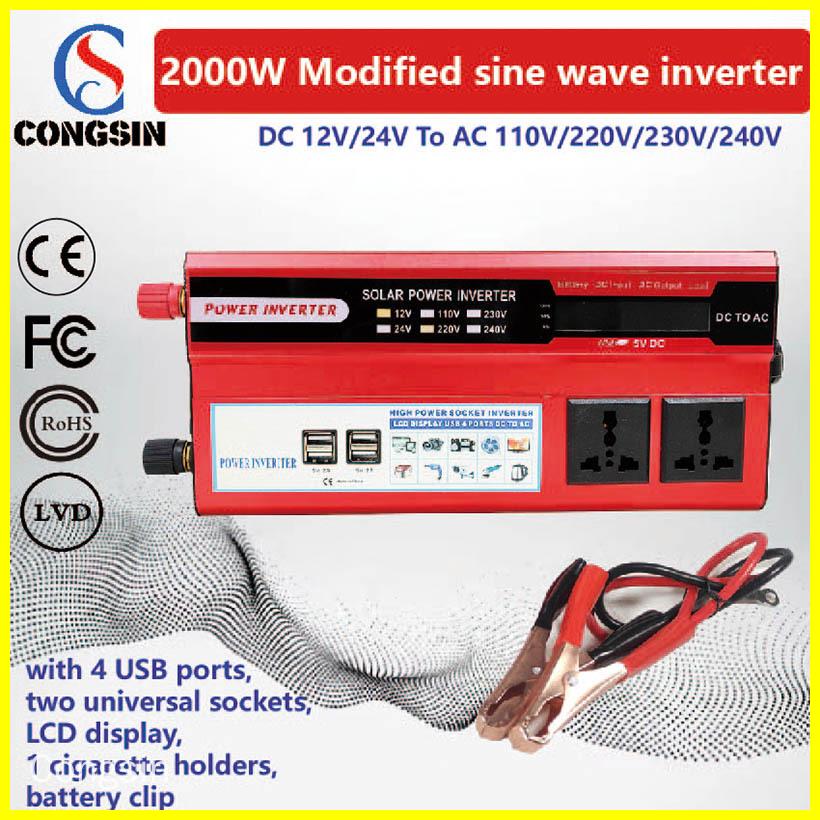 This product is a 2000 W modified sine wave inverter with DC 12 V input and AC 220 V output and a rated power of 1200 W. It features 4 USB ports, an LCD display, two universal sockets, one cigarette lighter socket, and battery clips.