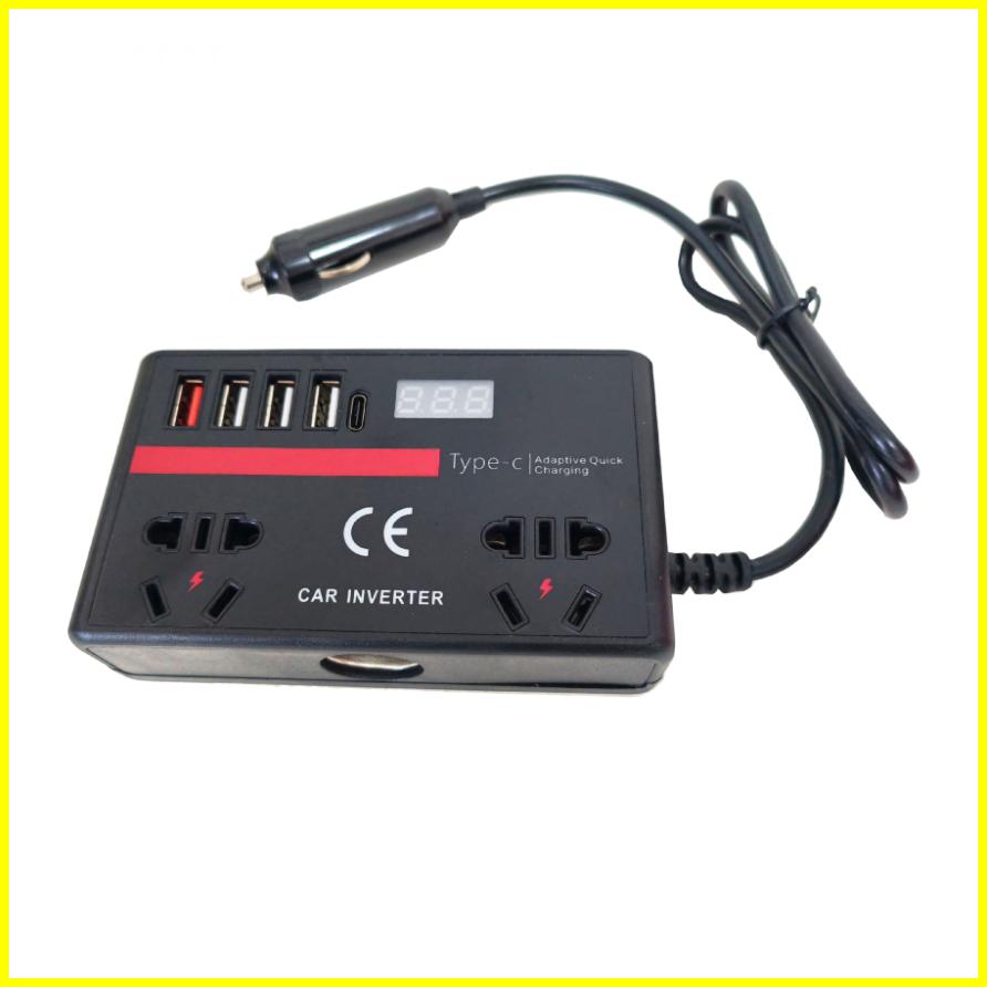 This product is a 2000 W modified sine wave inverter with DC 12 V input and AC 220 V output and a rated power of 1200 W. It features 4 USB ports, an LCD display, two universal sockets, one cigarette lighter socket, and battery clips.
