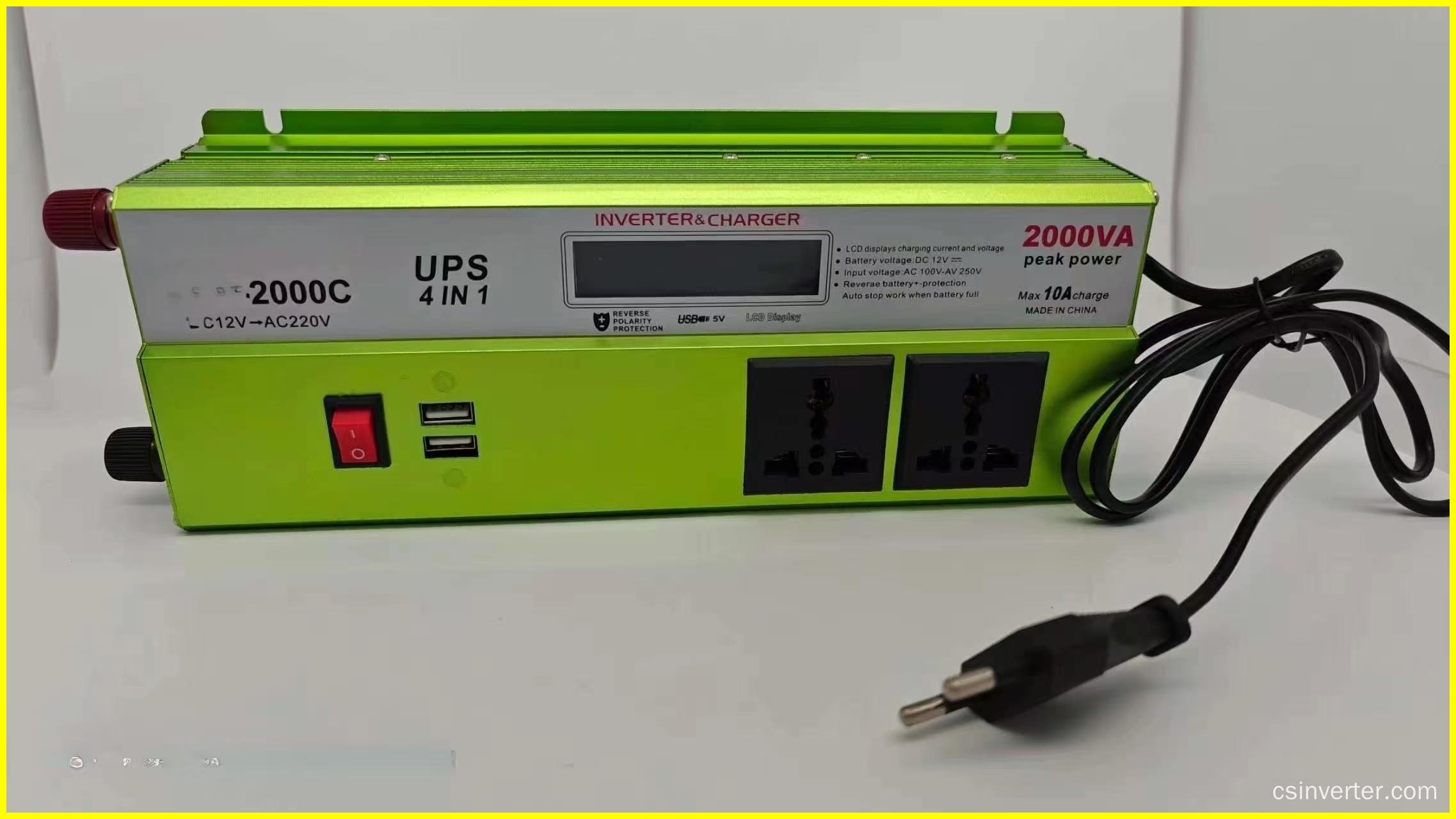 The CXUPS-2000W modified sine wave inverter combines UPS charging functionality with DC 12V input and AC 220V output. It features an LCD display, three AC outlets, four USB ports, and independent DC/AC control switches. Ideal for home, vehicle, camping, and emergency power applications.